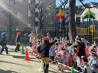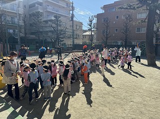 2024 年 2 月 1 日公開 園内節分会 園内節分会を行いました。それぞれ自分で作った鬼のお面を身につけ、豆入れをもって鬼に向かって「鬼は外!福は内!」と掛け声をかけながら元気に鬼に豆を投げていました。幼稚園のお友達には心の中に泣き虫鬼やいたずら鬼がいたら一緒にやっつけちゃおう!と話しているので、一生懸命豆まきをしている様子が見られ、とても楽しい豆まきとなりました。