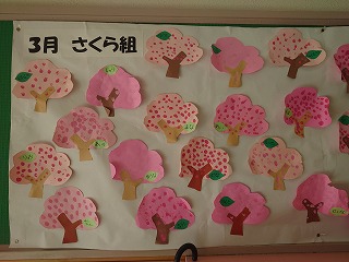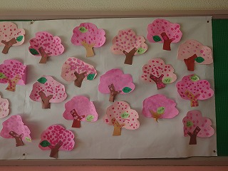 2024 年 3 月 13 日公開 3月の玄関壁面 3月の玄関壁面は年少さくら組の「さくら」です!木の幹と満開の桜をハサミで切り、桜の花は指スタンプでかわいらしく仕上げました。元気いっぱいのさくら組さん達はもうすぐ年中組に進級します。1年で本当に頼もしく素敵なお兄さんお姉さんに成長したさくら組さんの姿を、この満開の桜が表しているようです。