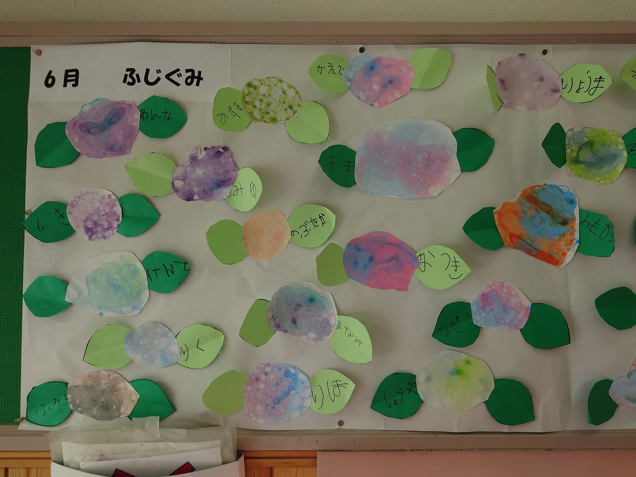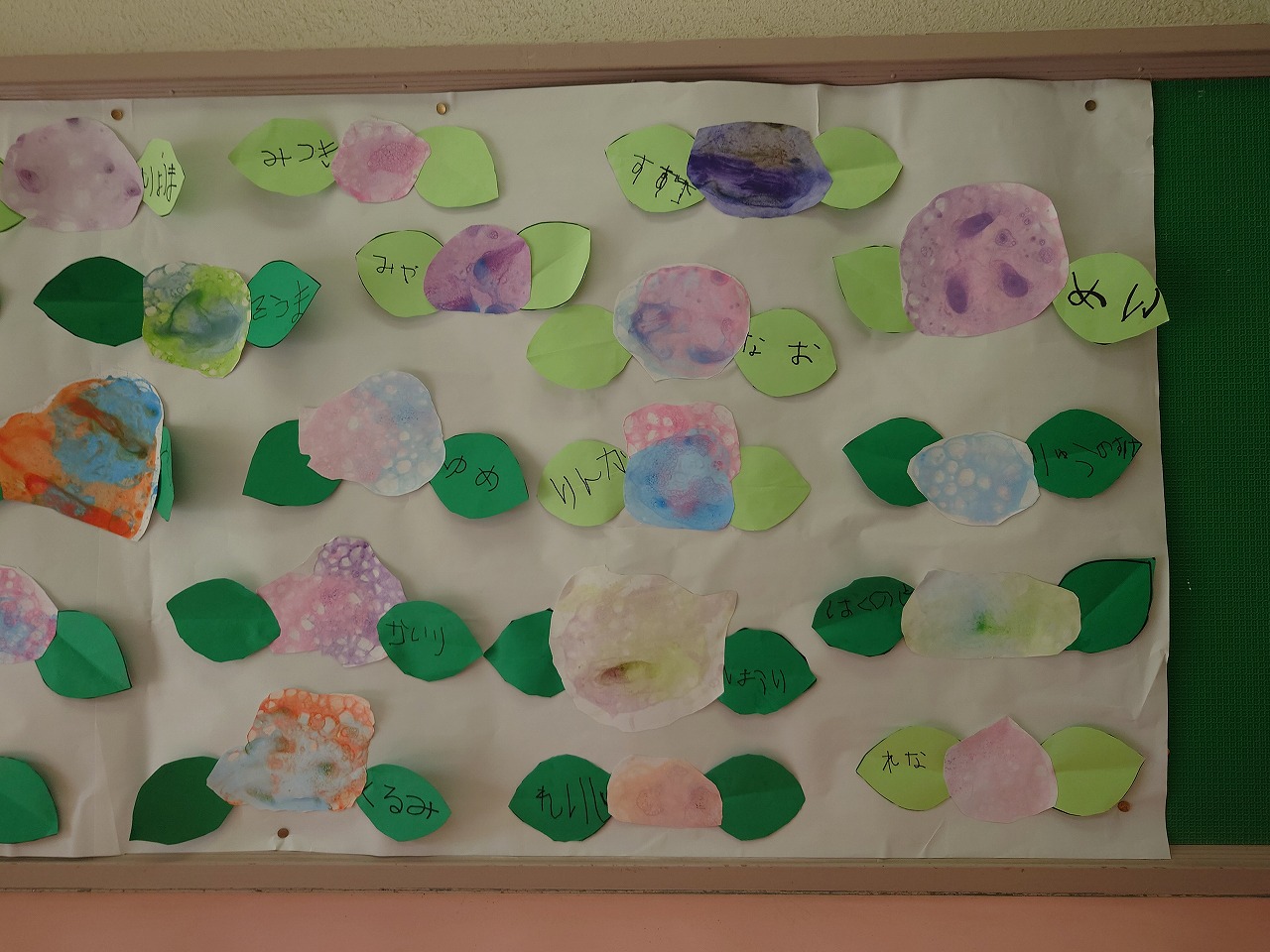 2024 年 6 月 7 日公開 6月の玄関壁面 6月の玄関壁面は年長ふじ組の「あじさい」です。シャボン玉液に絵具を混ぜたものを紙にふうーっと吹き付け、泡の形がそのまま画用紙に形作られるシャボン玉アートという技法を用いて梅雨時に庭を彩るかわいいお花「あじさい」を表現しました。やわらかく、優し気な雰囲気がとても素敵です。これから雨が多くなる季節となりますが、あじさいのように梅雨時にしか見られない素敵なものを発見していきたいと思います。