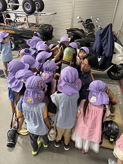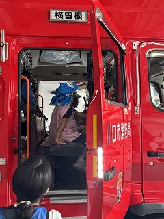 年長組が消防署見学に行きました。バスで横曽根消防署に到着すると、消防士さんたちに消防車の設備を見せていただいたり、消防車に乗せていただいたり、消防署の中の様々な場所を見学させていただきました。消防署の中には厨房があったり、トレーニングルームがあったりと、知らなかったことが沢山ありました。幼稚園に帰ってから「たのしかった!」「またいきたい!」と大興奮の年長さん。消防士さんたちの仕事の大切さを知ることで、今後より一層防災の意識を高めることに繋がっていくと嬉しく思います。