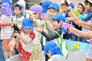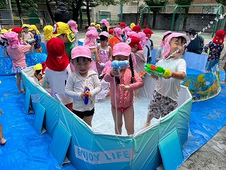 2024 年 7 月 20 日公開 水遊びを楽しみました! 梅雨も明け、夏本番となりました。。共生幼稚園の水遊びは園庭に沢山のプールを出して、水鉄砲やじょうろなど、持参した玩具で遊びます。友だち同士で水の掛け合いをしたり、先生を狙って先生もびしょびしょになったりと、夏休み前のとっても楽しい一日となりました!