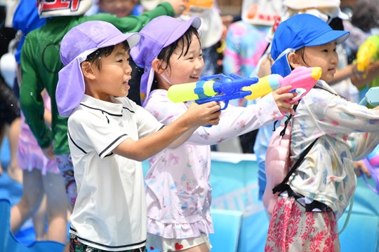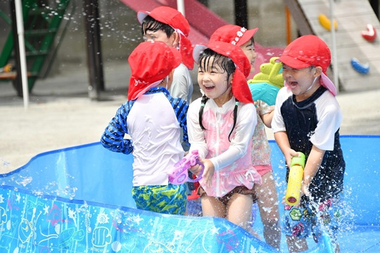 2025 年 7 月 16 日公開 水遊び 夏の暑い一日に各学年で水遊びを行いました。園庭に並んだ沢山のプールに入り、持参した水鉄砲や玩具でお友達や先生と水を掛け合って楽しみました。飛距離のある水鉄砲で先生を狙って水をかけてくるお友達も多くいて、先生達もびしょびしょになりながら応戦していました!とても楽しい一日となりました。