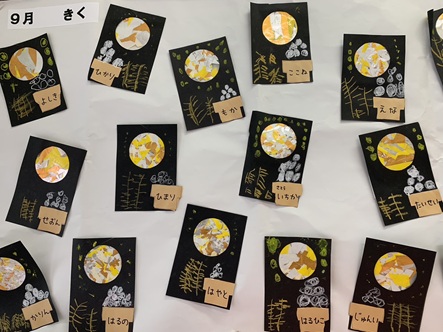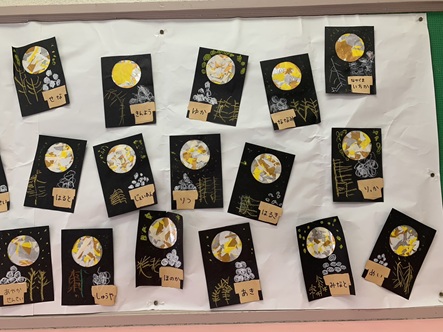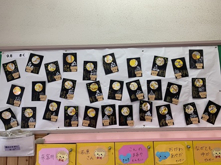 2025 年 9 月 4 日公開 9月の玄関壁面 9月の玄関壁面は年中きく組の「お月見」です。十五夜の夜にきらきらと輝くお月様、お月見団子とススキが風情よく飾られています。きらきらのお月様は折り紙を使ってちぎり絵で表現し、ススキは思い思いにクレヨンで描きました。秋らしい素敵な壁面となりました。