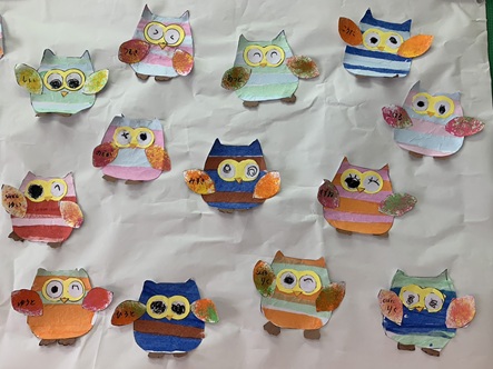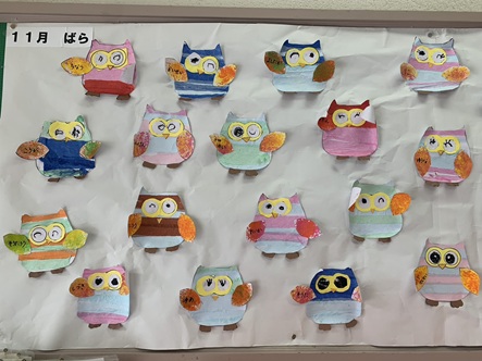 2025 年 11 月 12 日公開 11月の玄関壁面 11月の玄関壁面は年中ばら組の「ふくろう」です。ふくろうの体はお花紙をまっすぐちぎって、ふくろうの体らしいふわっとした雰囲気を表現しつつ、色鮮やかなしましま模様を作りました。羽の部分は、新聞紙を丸めて好きな色の絵の具につけてスタンプにし、トントンと画用紙につけることで柔らかい風合いになるよう工夫しました。秋の夜にホーホーと鳴くかわいいふくろうさんたちが見事に表現された素敵な作品となりました。