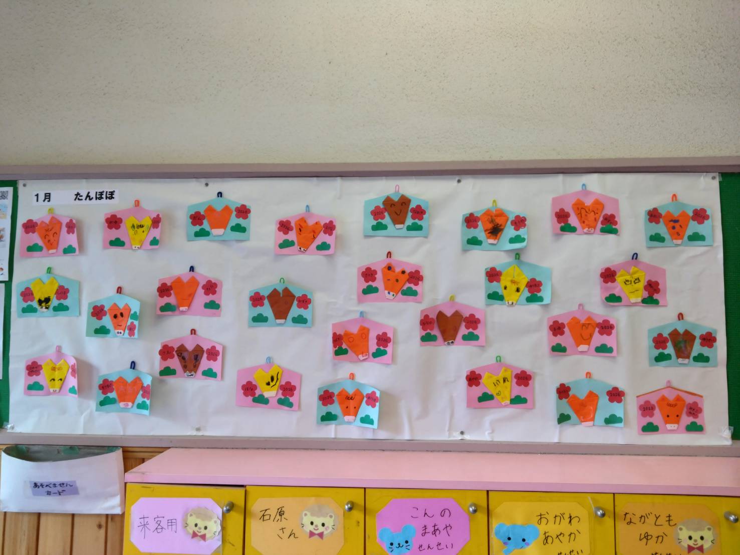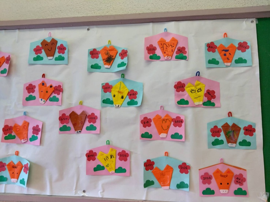 2026 年 1 月 8 日公開 1月の玄関壁面 1月の玄関壁面は年少たんぽぽ組の「絵馬」です。今年の干支である馬を折り紙で折り、思い思いに表情を描き入れました。その周りには梅の花と松で彩り、華やかな絵馬にすることが出来ました。お正月の風情溢れる素敵な作品となりました。
