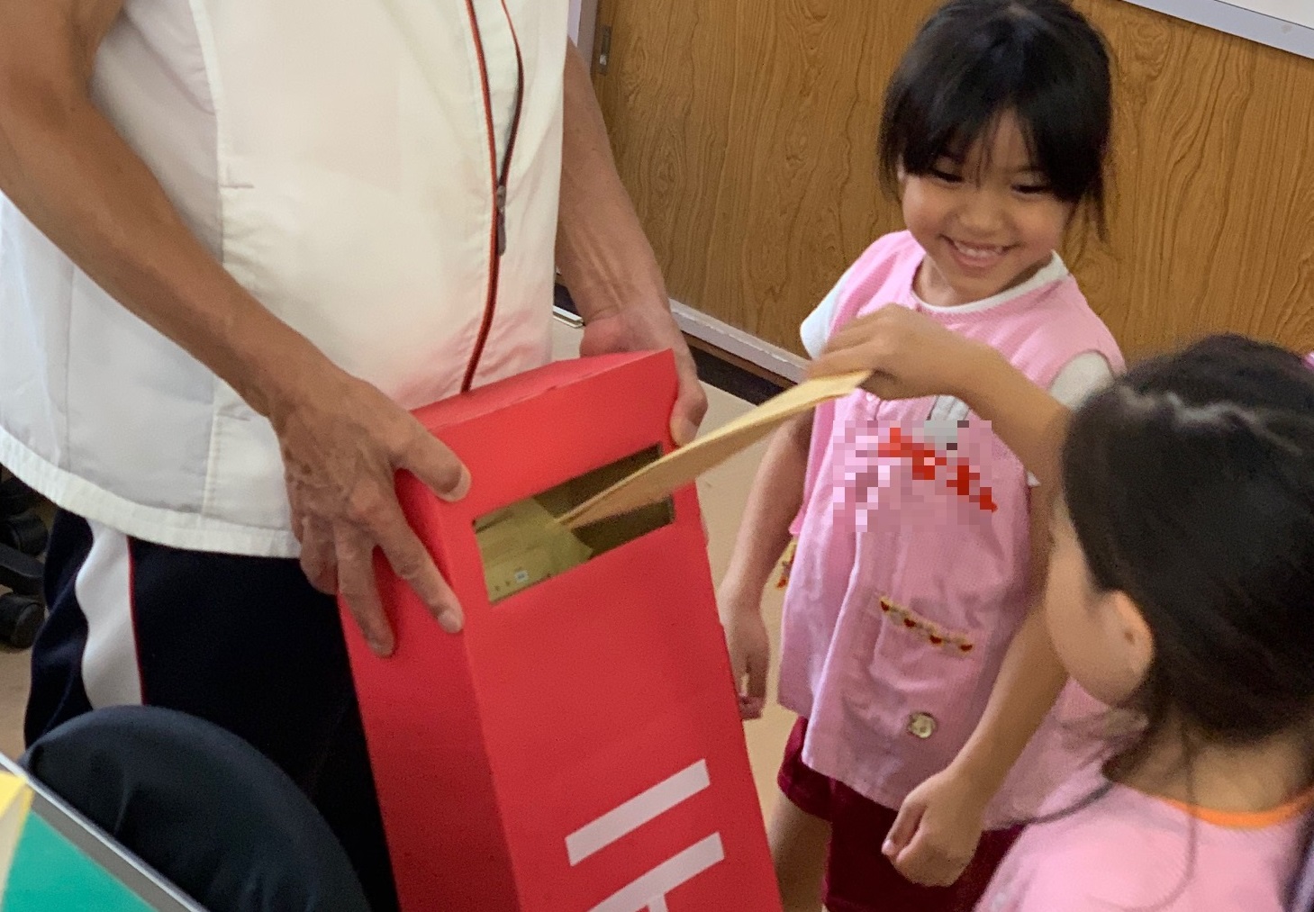2019 年 9 月 9 日公開 敬老の日に向けて 敬老の日が近いということで、祖父母の皆さんに普段なかなか伝えられない感謝の気持ちを手紙にしてお送りすることにしました。園児たち一人一人が心を込めて書いたお手紙を手作りポストに投函しました。子どもたちみんなのの感謝の気持ちがおじいちゃん・おばあちゃんへ届く日が今から楽しみです♪